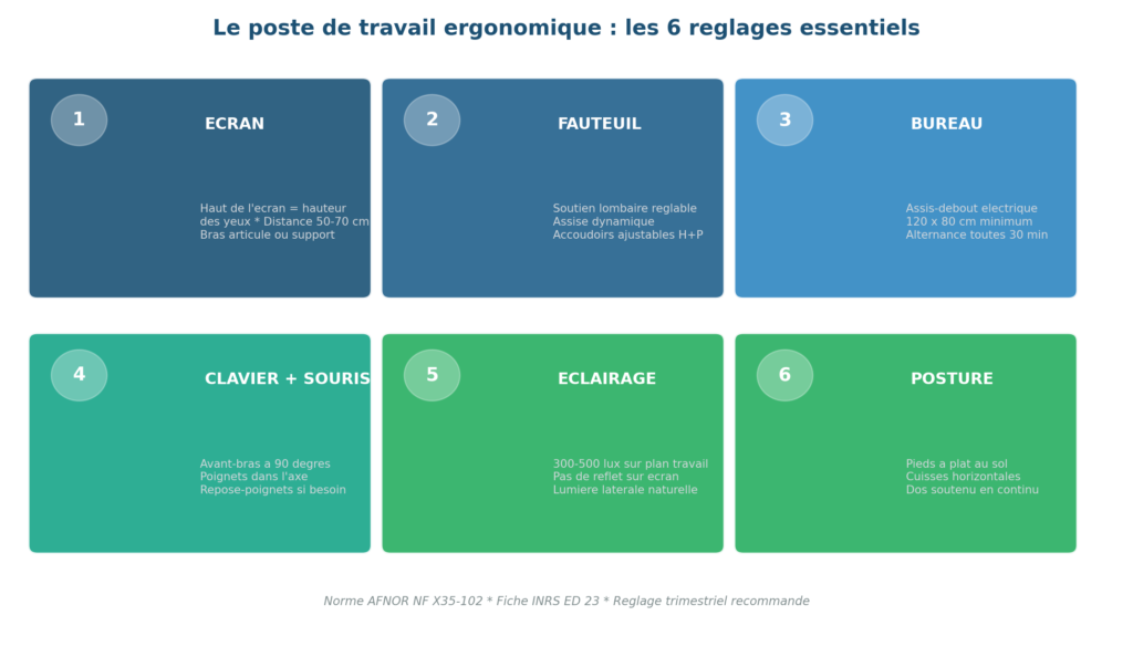 • 6 réglages essentiels transforment un poste standard en poste ergonomique : écran, fauteuil, bureau, clavier, éclairage, posture