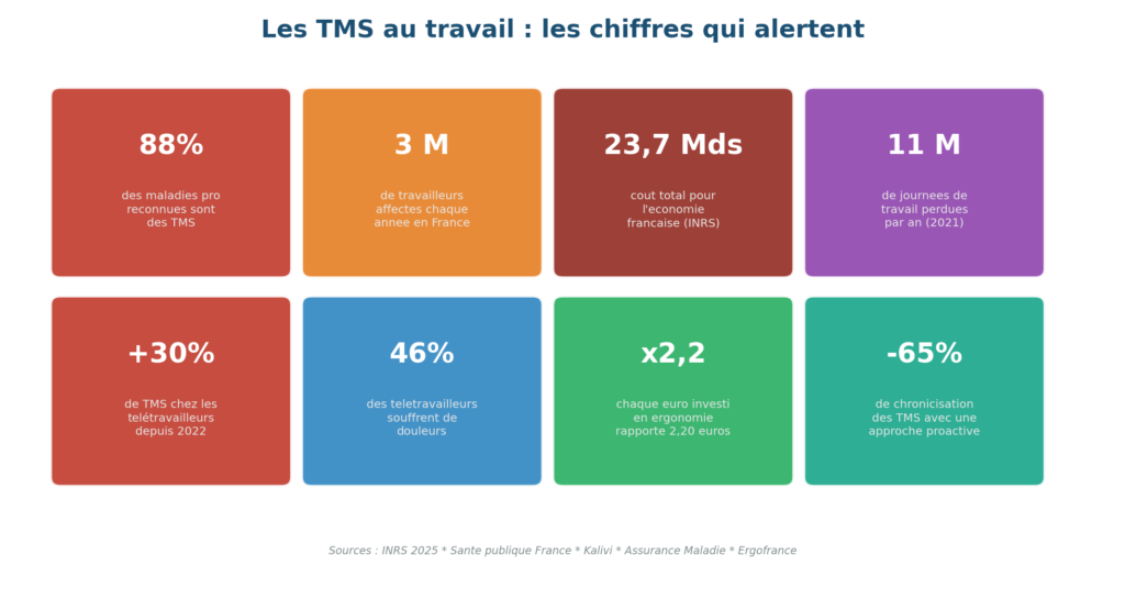 • 88 % des maladies pro sont des TMS — 3 millions de travailleurs, 23,7 milliards € de coût annuel