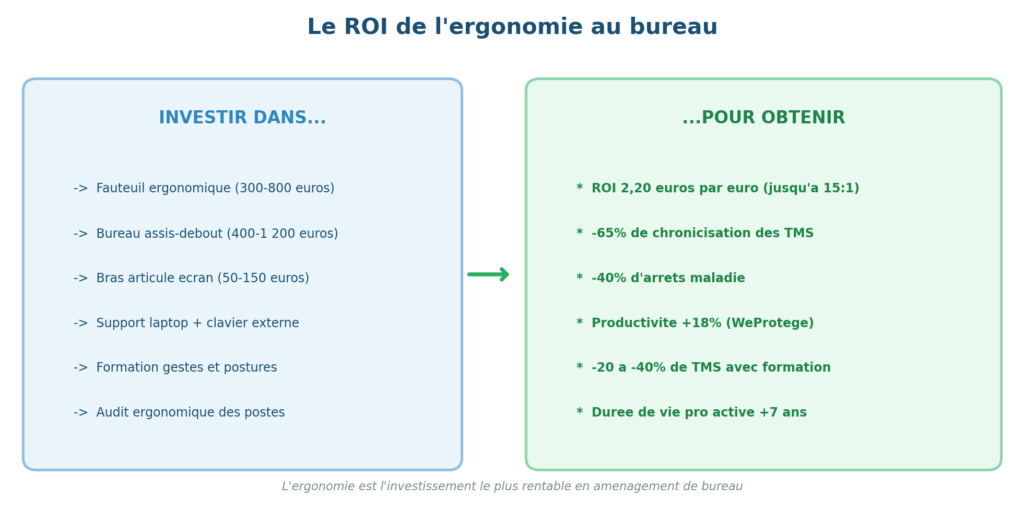 • Productivité : +18 % de productivité avec un poste ergonomique bien réglé (WeProtege). Sur 50 salariés à 40 000 € de coût, 18 % = 360 000 €/an de valeur créée.