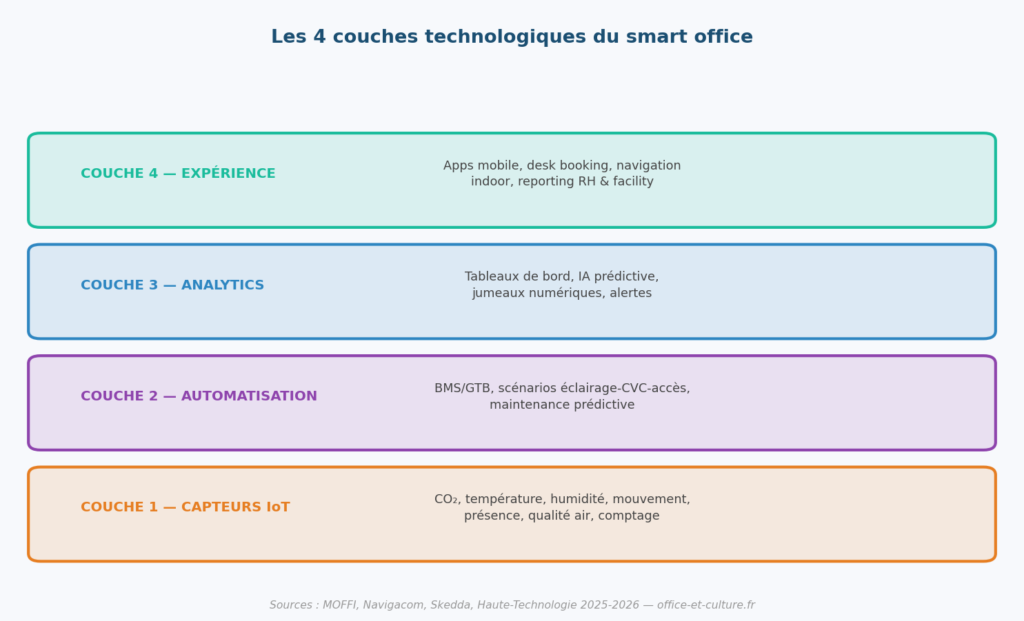 Un smart office complet s’articule autour de 4 couches technologiques imbriquées :