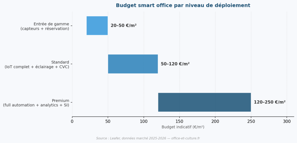 Le budget d’un smart office s’ajoute au coût d’aménagement classique. Les fourchettes varient selon le niveau de déploiement : de 20 à 50 €/m² en entrée de gamme (capteurs basiques + réservation), 50 à 120 €/m² pour un déploiement standard (IoT complet + éclairage + CVC), et 120 à 250 €/m² pour un projet premium (full automation + analytics + intégration systèmes d’information).
