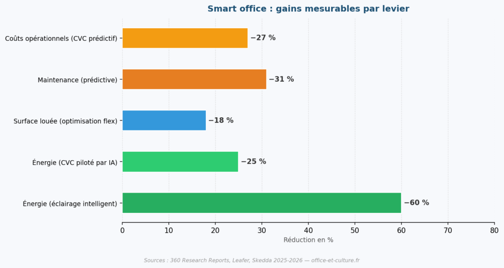 La dimension énergétique est l’argument ROI le plus immédiatement tangible du smart office. Combiné à une bonne stratégie de pilotage, un déploiement IoT permet de réduire significativement les consommations sans impacter le confort.
